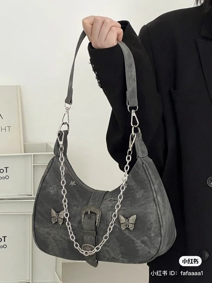 Introducing the ShadowCharm Butterfly Bag, a bold and captivating accessory designed for women who embrace confident, expressive, and stylish fashion. This striking grey shoulder bag blends edgy aesthetics with soft feminine accents, creating a unique look that instantly sets you apart. Its textured grey finish gives it a modern, slightly vintage feel, while the metallic butterfly embellishments add a touch of elegance and charm, making the bag both fierce and beautifully delicate at the same time.